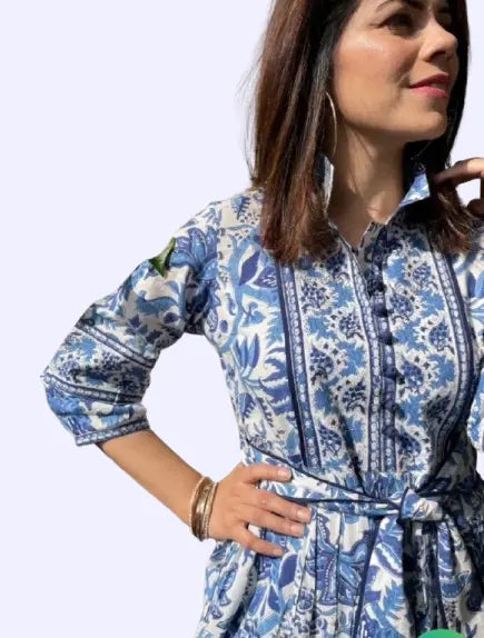 Bohemian Hand Printed Midi Dress - 100% Cotton Floral Summer Dress with Pockets and Belt | Mother's Day Gift