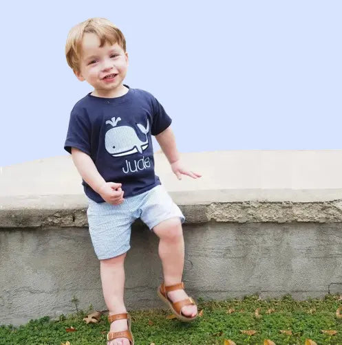 Give your little sailor the perfect seaside look with this adorable personalized outfit! Featuring a soft cotton whale embroidered tee and lightweight seersucker shorts, this outfit is perfect for a beach day, birthday, or everyday adventure.
